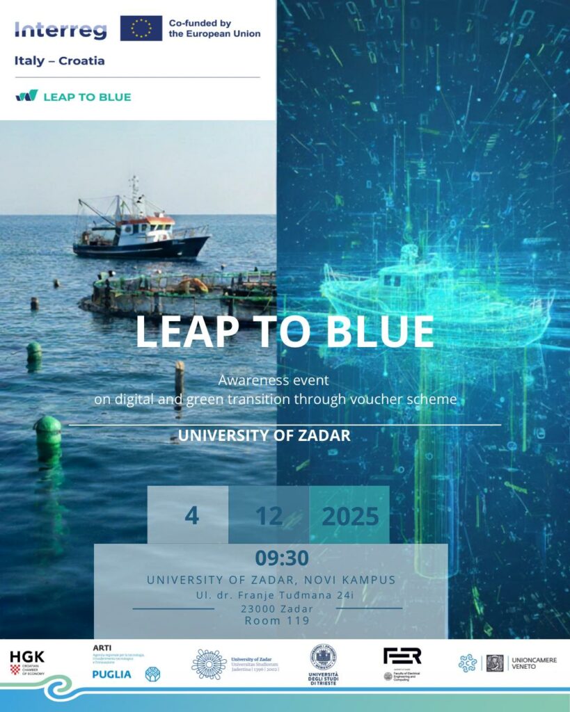 L’evento rientra nelle attività del Progetto LEAP TO BLUE (rif. ITHR0500560), finanziato dal programma Interreg Italia – Croazia 2021-2027. Il progetto nasce con l’obiettivo di accompagnare le imprese della Blue Economy nella duplice sfida della transizione digitale e verde, promuovendo la cooperazione transfrontaliera e rafforzando le capacità di oltre 160 piccole e medie imprese.