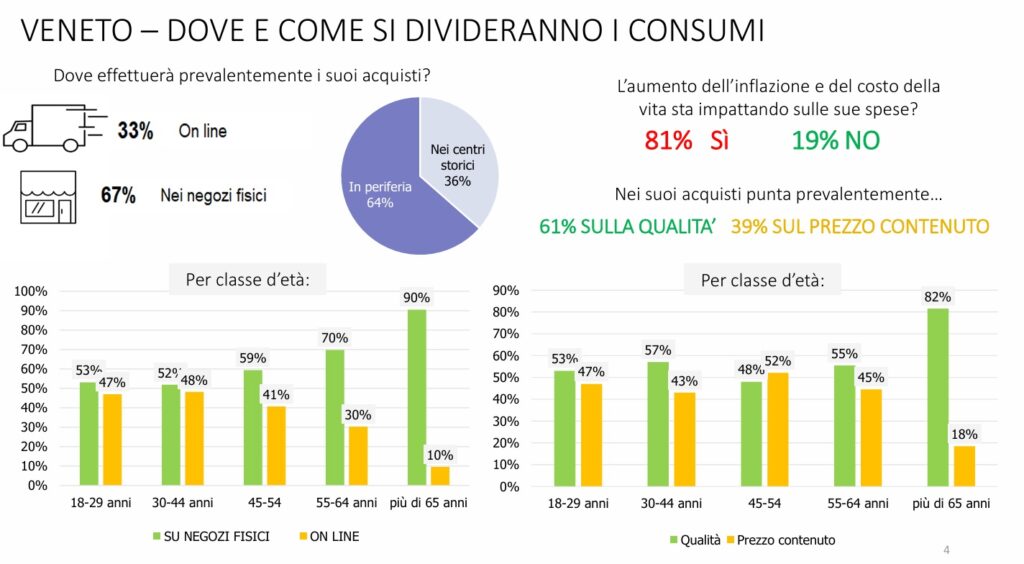 Un dato particolarmente significativo per gli operatori del commercio è la netta preferenza dei veneti per la qualità: ben il 61% dichiara di puntare su questo piuttosto che sul prezzo contenuto. Un orientamento che premia il commercio specializzato, i prodotti artigianali e di eccellenza, il servizio personalizzato e la competenza professionale. Interessante notare come questa propensione cresca con l’età: gli over 65 privilegiano la qualità nell’82% dei casi, nelle fasce medie (tra i 30-44 anni) al 57%.