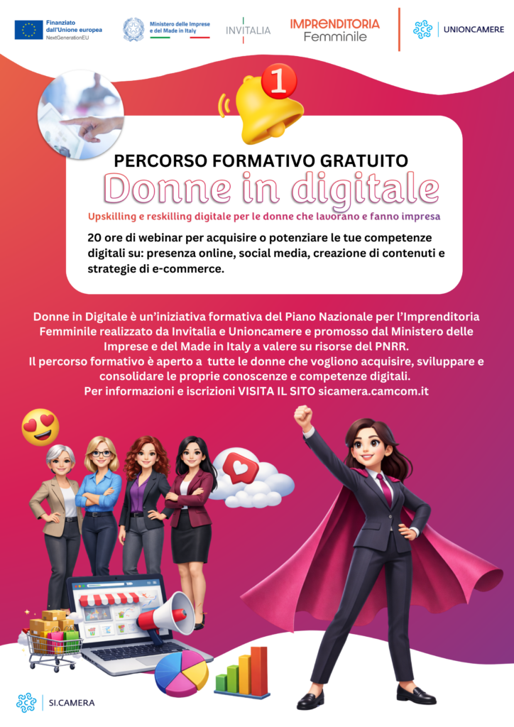 “Donne in Digitale” è stato progettato e realizzato da Si.Camera, rientra nel Piano nazionale per la promozione dell’imprenditorialità femminile, è stato promosso dal Ministero delle Imprese e del Made in Italy e realizzato da Invitalia, in collaborazione con Unioncamere.