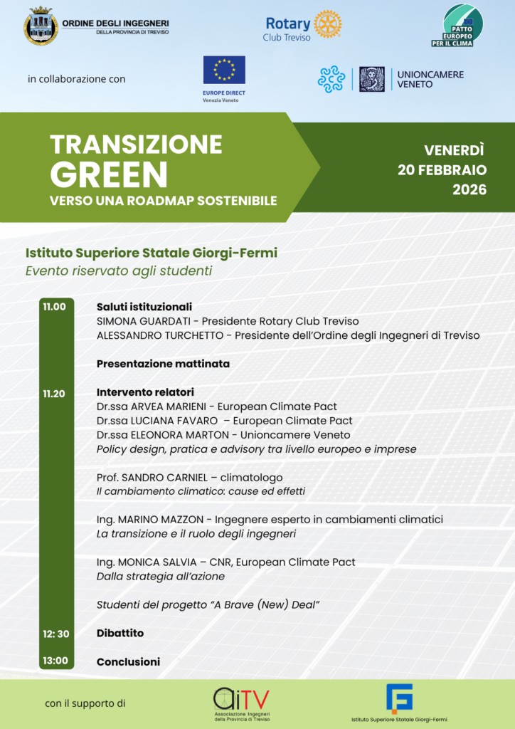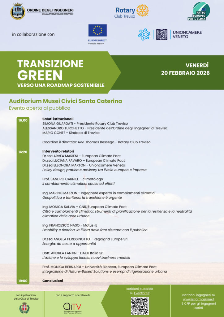 Il convegno “Transizione green – verso una roadmap sostenibile”, promosso dall’Ordine degli Ingegneri di Treviso, dal Rotary Club Treviso e dal Patto Europeo per il Clima con il patrocinio della Città di Treviso e in collaborazione con Europe Direct Venezia Veneto e Unioncamere del Veneto, vuole parlare ai cittadini e offrire una visione chiara e operativa delle trasformazioni in atto, mettendo in dialogo istituzioni, mondo professionale, imprese e ricerca.