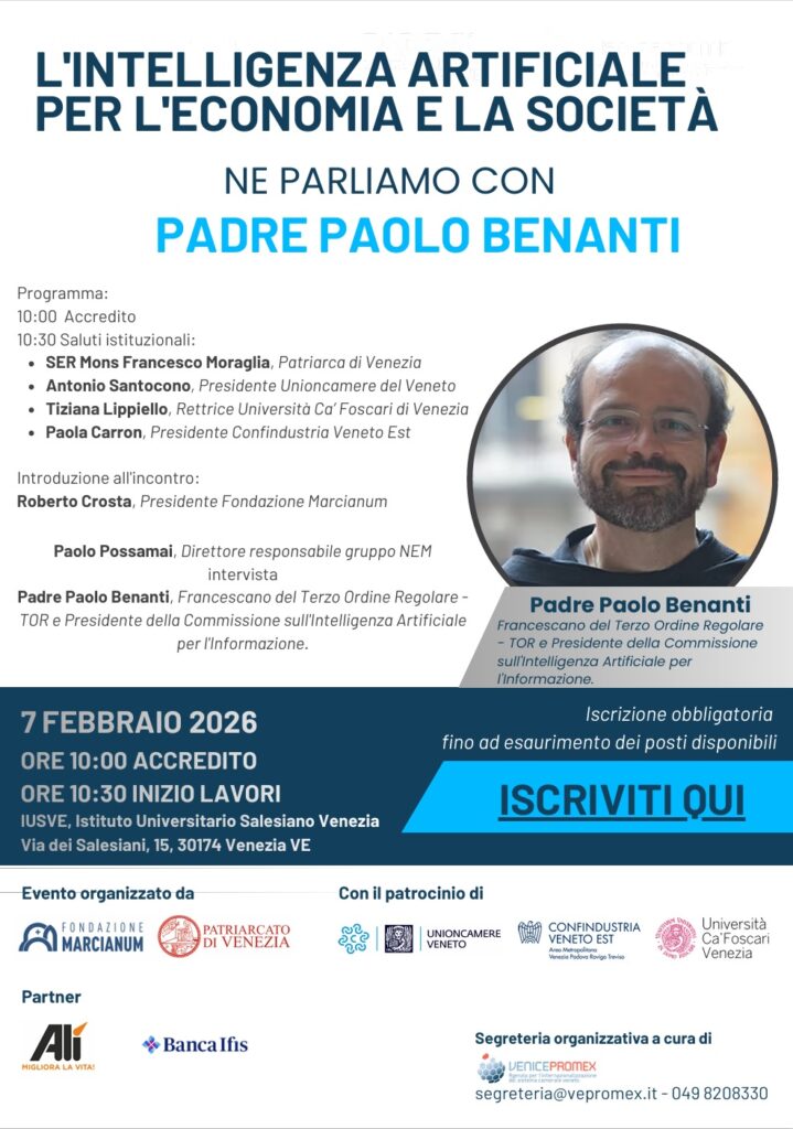 L’incontro costituirà un’importante occasione di riflessione e dialogo sull’impatto dell’intelligenza artificiale nella trasformazione dei sistemi economici e sociali contemporanei, grazie al contributo autorevole di Padre Paolo Benanti, docente e studioso di primo piano nel campo delle tecnologie emergenti nonché presidente della Commissione sull’Intelligenza Artificiale per l’Informazione.