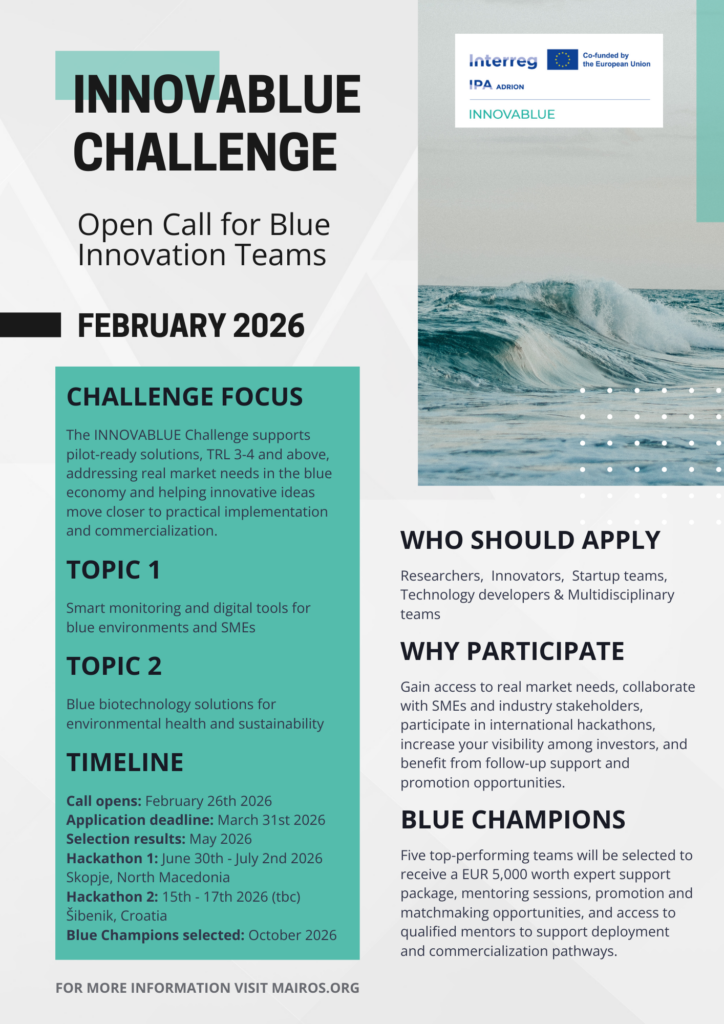 Il bando si è aperto il 26 febbraio 2026. Per partecipare, è necessario registrare il proprio team entro e non oltre le ore 12:00 del 31 marzo 2026 attraverso la piattaforma Mairos: https://mairos.org/news/innovablue-challenge-open-call-for-blue-innovation-teams/.