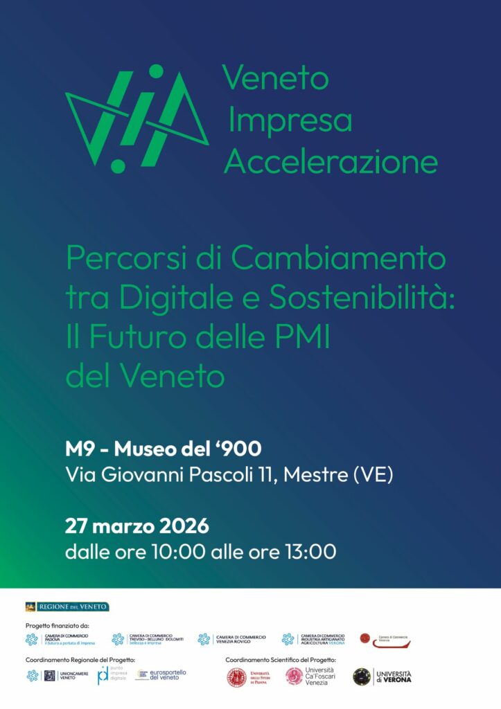 [online 05.03.2026] Venerdì 27 marzo 2026, dalle ore 10.00 alle 13.30, presso il Museo M9 – Museo del ‘900 di Mestre, si svolgerà l’evento “Percorsi di cambiamento tra Digitale e Sostenibilità: il futuro delle PMI del Veneto”, evento conclusivo del Progetto PID Veneto dedicato alla trasformazione digitale e sostenibile delle piccole e medie imprese del territorio.