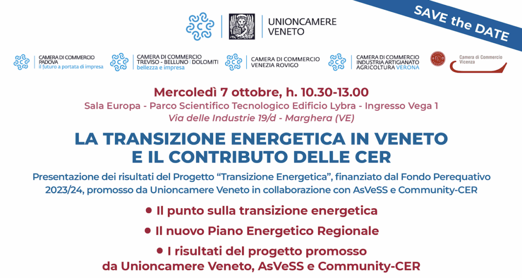 Martedì 7 ottobre Unioncamere del Veneto, AsVeSS e Community Cer organizzano il convegno conclusivo del Progetto Fondo Perequativo Transizione energetica 2023-2024 dal titolo “La transizione energetica in Veneto e il contributo delle CER”.