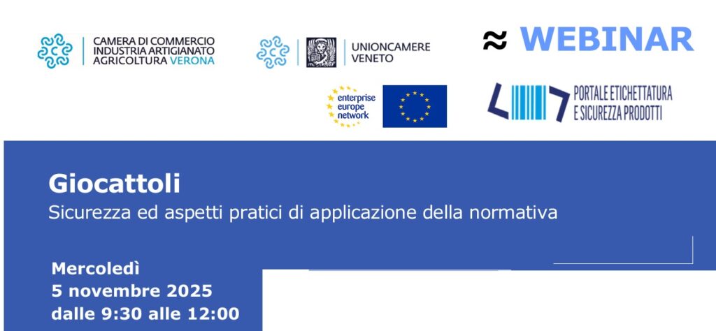 [online 23.10.2025] La Camera di Commercio Verona, in collaborazione con lo Sportello Etichettatura e Sicurezza ProdottiUnioncamere del Veneto e il Laboratorio Chimico Camera di Commercio di Torino, organizza un webinar dedicato alla tematica della sicurezza dei giocattoli in programma mercoledì 5 novembre 2025 dalle ore 9.30 alle 12.00.